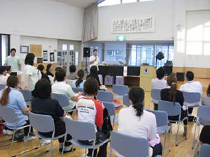 2人1組になって、講師の方の説明に沿って、お互いの手や足をマッサージしていきます。