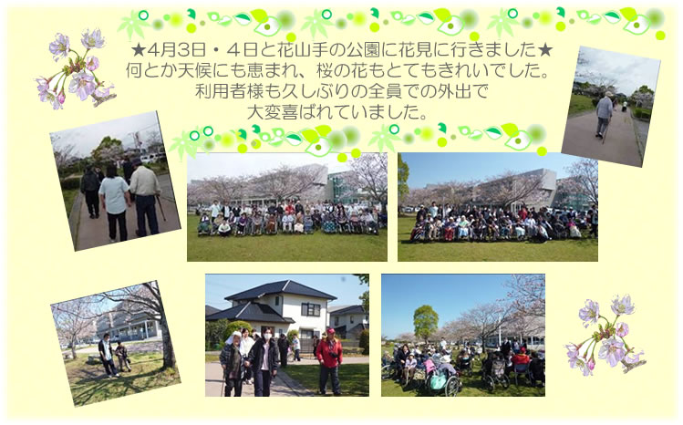 4月上旬、良いお天気が続き、 急遽『お弁当』を作り外でお食事をすることに(*^_^*) 春の心地良い日差しの中、皆様笑顔での食事、時折落ちてくる桜の花びらに『きれいやねー』と歓喜の声が沸いていました。 春の陽気の中とても楽しい食事会になりました。